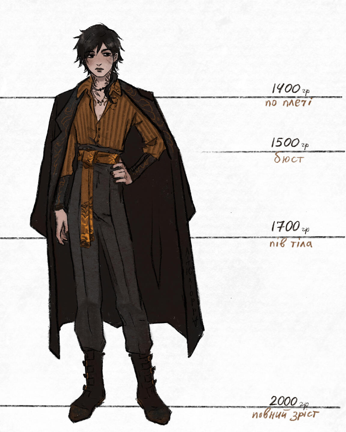 Можете розповісти про нього, щоб я краще його зрозумів✨Надайте якомога більше референсів, які, на вашу думку, відповідають ідеї, атмосфері та зовнішності персонажа, його одягу.