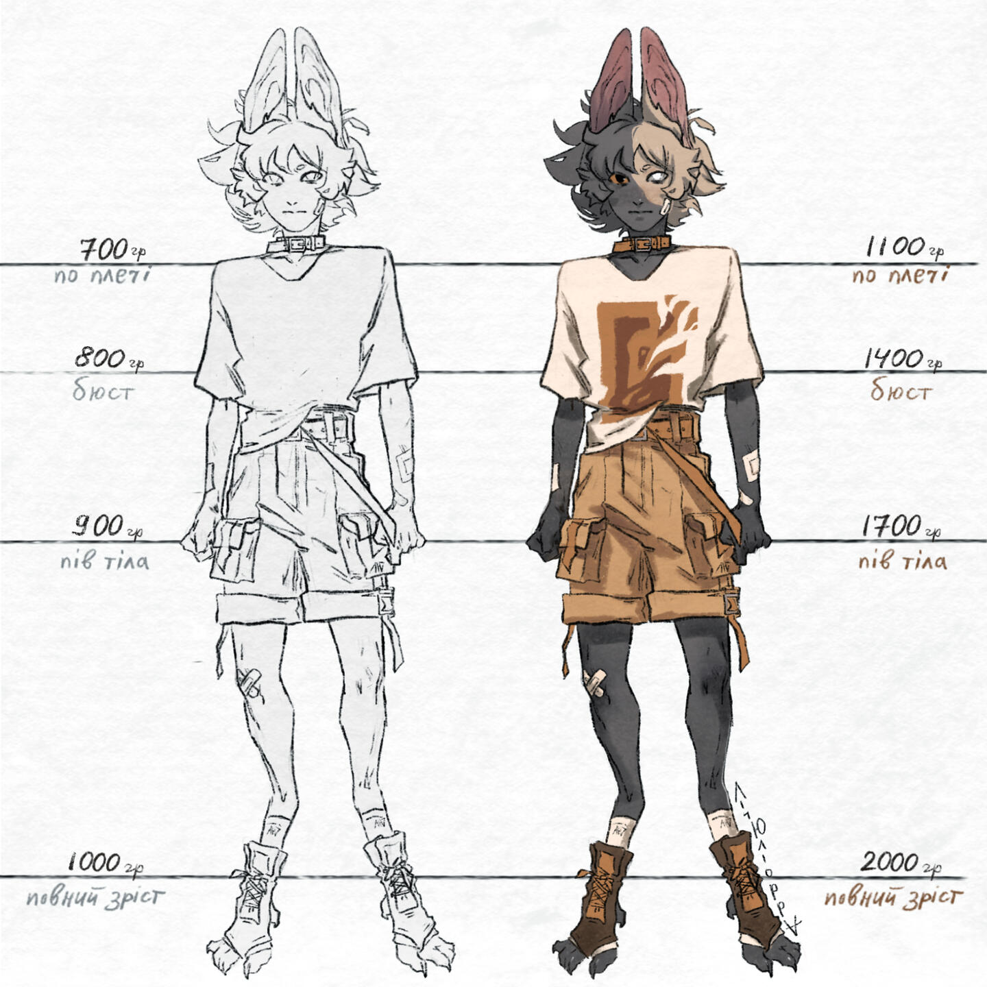 Скажіть, якщо вас цікавить певний формат роботи для друку або подібногоДизайн персонажа з нуля (без рефів та опису) під певний сеттінг + 500 гр✨Після того як ми все обговоримо і затвердимо, ви можете здійснити передоплату, після чого я почну роботу✨Протягом першого дня я надішлю вам ескіз, щоб перевірити, чи зрозумів я ідею